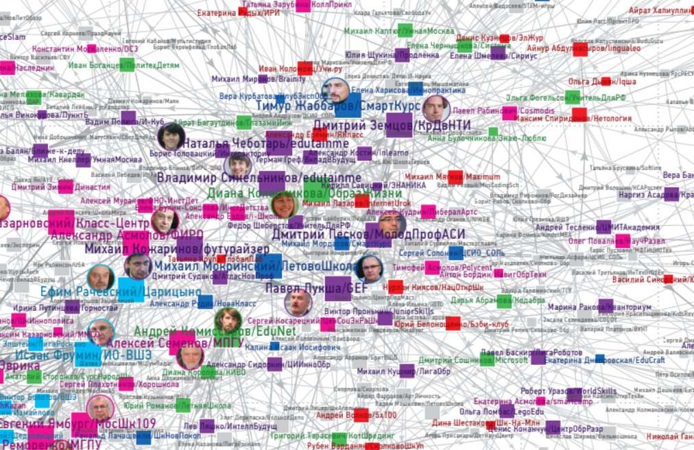Мы выпустили три исследования, на которых показали образование и социальную сферу в лицах. Это карты, на которых представлены лидеры, проекты и связи между ними.
